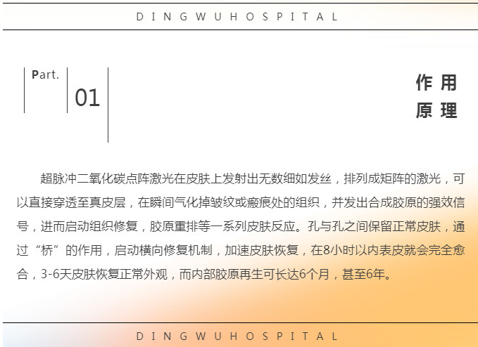 通过激光点阵模式在皮肤上均匀地打上微细的小孔,从而在皮肤层形成热剥脱、热凝固、热效应三个区域。继而引起一连串的皮肤生化反应,激活皮肤成纤维细胞,使真皮胶原纤维和弹力纤维产生分子结构的变化,数量增加,重新排列,加快痘坑的平复,嫩滑肌肤。尤其适合对中重度痘坑的治疗。