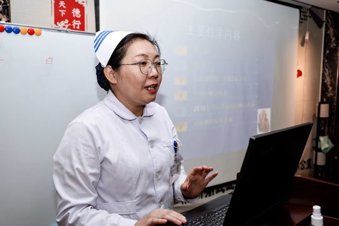 护理部郭庆华主任授课: 除颤仪的使用指征、电除颤的目的、原理、电除颤正确操作的方法和注意事项等内容。 实操给大家演示了心脏电除颤技术的操作流程,把每一个操作要点详细地为大家进行了示范和讲解,并反复强调其中的关键步骤,为大家上了一堂生动的急救技术实训课。